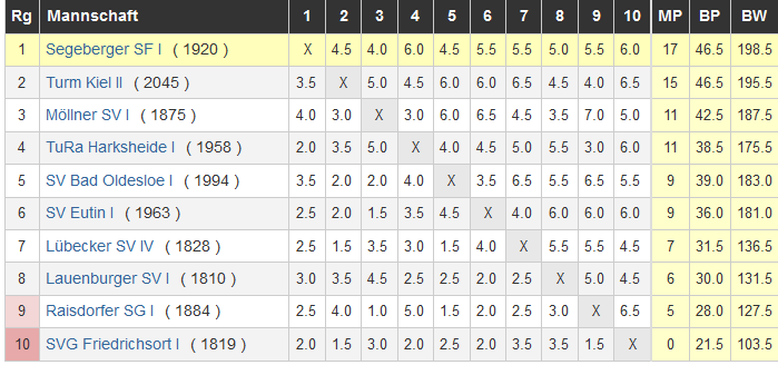 Während sich Bad Oldesloe weiterhin verlustpunktfrei in der Spitzengruppe befindet, kann Lauenburg nach dem ersten Saisondrittel mit 4 : 2 Mannschaftspunkten und dem bisherigen Saisonverlauf aber auch durchaus zufrieden sein.
