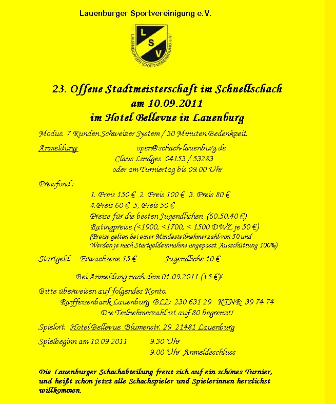 38 Teilnehmer kämpften im Hotel Bellevue nun schon zum 29. Mal um die Lauenburger Schnellschachmeisterschaft. Sieger wurde am Ende FM Markus Hochgräfe vom SC Diogenes Hamburg vor FM Jonah Krause (St. Pauli) und Jeremy Hommer (SC Turm Lüneburg). Bester Lauenburger wurde Claus Lindges auf Rang 17. Ergebnis und Fortschritttabelle unter Lauenburg-Open --
